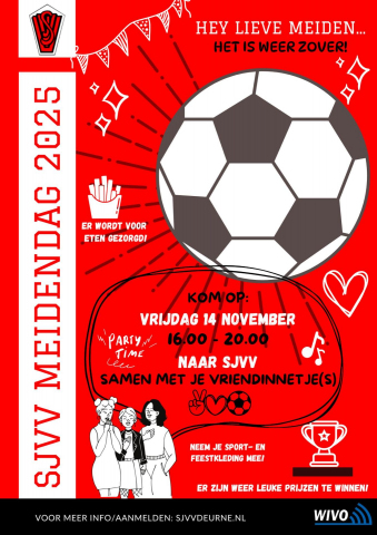 Op 14 november 2025 staat er vanaf 16.00 uur weer een super gave meidendag op het programma! SJVV is bij uitstek de club voor meidenvoetbal. Met 3 dames teams, een volledig meidenteam bij de jeugd en diverse meiden die gemixt bij de jongens spelen.