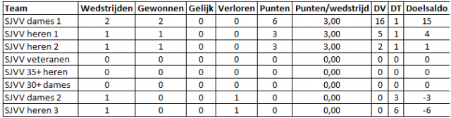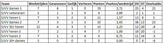 | SJVV heren 1 | 22 | 7 | 7 | 8 |
