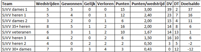 | SJVV heren 2 | 22 | 7 | 7 | 8 |