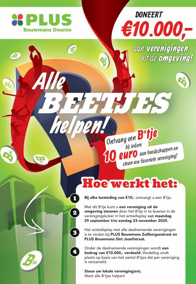 Plus Bouwmans organiseert een actie waarbij klanten bij elke besteding van 10 euro een 'B'tje` ontvangen. Met dit B'tje kunnen klanten hun favoriete vereniging steunen door het B'tje in te leveren in de verenigingskoker in het actiedisplay in de winkel. Onder de deelnemende verenigingen wordt een bedrag van 10.000 euro verdeeld, op basis van het aantal B'tjes dat een vereniging heeft ontvangen. De actie duurt van maandag 23 september tot en met zondag 23 november. Geef jij je B'tje aan SJVV? Dankjewel!